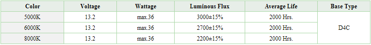 D4C HID전구는 OEM 전구 교체용으로 당사에서 특수 설계 제작된 D4S, D4R겸용 베이스를 사용하며, 이미 E-MARK 등 유럽인증을 받은 기술력을 바탕으로 생산된 전구의 완성품으로 전구에 수은이 포함되지 않은 환경 친화적인 Mercury Free차세대 hid 전구입니다.
